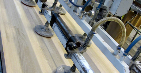 Die Fertigung verläuft folgendermaßen – das Rohholz wird während des gesamten Verarbeitungsprozesses einer ständigen Qualitätskontrolle unterzogen. Unter anderem wird die Holzfeuchtigkeit in jedem Zuschnitt ermittelt, um gleichbleibend gute Endprodukte zu erhalten. Die Massivholzplatte wird zur Verleimung in der Hochfrequenzpresse (nach DIN EN204-D4/E1) per Hand aufgelegt. Der verwendete Leim ist formaldehydfrei.