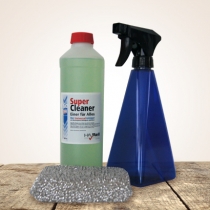 Super Set zum Vorzugspreis. Das Set beinhaltet 500 ml Reiniger Konzentrat, eine sehr handliche dekorative Sprühflasche 500 ml und einen Spezialschwamm, der keine Kratzer verursacht und super geeignet für Hartnäckige Verschmutzungen ist.